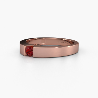 This 14 Carat rose gold ring is called Lizzy 1 and is set with ruby. Do you keep up with the latest fashion trends? Do you want a unique engagement ring that matches your lifestyle? This edgy engagement ring is an extraordinary ring which can be custom-made to fit your or her personal style. This modern rose gold engagement ring is set with ruby. Our ruby are carefully selected for this specific ring in order to create the best effect. Our expert goldsmith will create your ring in our own artisan studio where the ruby will be set with great care. The ring will then be polished to perfection. Nothing but the best for the love of your life! This jewel is created to add sparkle to your finger, each jewel is lovingly made by hand by our goldsmiths.By using our modern techniques, we can design and customize the finest quality jewels with the utmost care for you. Our engagement rings are always priced 30 percent lower than other jewellers. We make engagement rings to order so we don't have to maintain a large stock. If you have a certain budget, we are more than happy to advice you accordingly.Do you have a specific ring in mind? One you came across somewhere. Please feel free to tell us your wishes and we will turn your design into a unique engagement ring. You can follow the development of your ring design because we use 3D drawings. This gives you a realistic preview of your design. We will gladly send you a non-binding offer, based on a fair price/ quality ratio. It will amaze you.To make it easier for you, we offer a 30 day return policy. Check our terms and conditions.