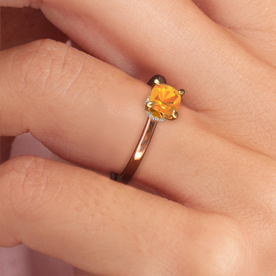 The ring shown above is called the Crystal CUS 3, we call this a solitaire ring because it contains a single gemstone. The engagement ring is made in 14 Carat rose gold and has a cushion citrin of 5 mm. This fashionable rose gold solitaire ring with exquisite cushion citrin is a beautiful engagement ring. The open prong setting allows light to strike the gemstone from various angles. The ring also stands out because of the high positioning of the gemstone. Because diamonds symbolize true love and purity, they make the perfect gift for the love of your life. The symbol of eternal love is the centerpiece of this solitaire ring. Like a diamond, all other types of precious metal have their own attributed symbolic meaning. You can compile the solitaire engagement ring yourself in various precious metal combinations. This one has the combination of 14 Carat rose gold with gold. Each piece of jewelry is made by a team of passionate goldsmiths and jewel designers. This will make your crown jewel truly eye-catching.By using a combination of the latest modern techniques, combined with ancient crafting, we can make all our engagement rings in our own studio. Each jewel is made to order. This is advantageous because we can offer you a price you won't find anywhere else.Our designers and goldsmiths work together each day, creating new jewels. Perhaps you have found a nice fashionable engagement ring somewhere, which can be used to customize your unique ring. Please feel free to contact us. We will make you an offer, based on a fair price/ quality ratio, which will amaze you.To make it easier for you, we offer a 30 day return policy. Check our terms and conditions.