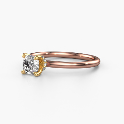 The ring shown above is called the Crystal CUS 3, we call this a solitaire ring because it contains a single gemstone. The engagement ring is made in 14 Carat rose gold and has a cushion lab grown diamond of 0.70 crt. This fashionable rose gold solitaire ring with exquisite cushion lab grown diamond is a beautiful engagement ring. The open prong setting allows light to strike the gemstone from various angles. The ring also stands out because of the high positioning of the gemstone. Because diamonds symbolize true love and purity, they make the perfect gift for the love of your life. The symbol of eternal love is the centerpiece of this solitaire ring. Like a diamond, all other types of precious metal have their own attributed symbolic meaning. You can compile the solitaire engagement ring yourself in various precious metal combinations. This one has the combination of 14 Carat rose gold with gold. Each piece of jewelry is made by a team of passionate goldsmiths and jewel designers. This will make your crown jewel truly eye-catching.By using a combination of the latest modern techniques, combined with ancient crafting, we can make all our engagement rings in our own studio. Each jewel is made to order. This is advantageous because we can offer you a price you won't find anywhere else.Our designers and goldsmiths work together each day, creating new jewels. Perhaps you have found a nice fashionable engagement ring somewhere, which can be used to customize your unique ring. Please feel free to contact us. We will make you an offer, based on a fair price/ quality ratio, which will amaze you.To make it easier for you, we offer a 30 day return policy. Check our terms and conditions.
