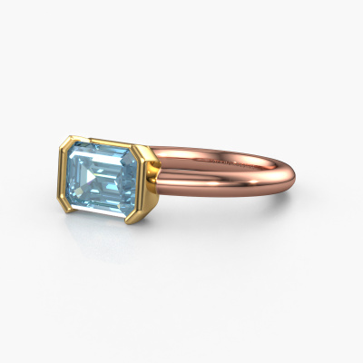 The ring shown above is called the Tayler EME, we call this a solitaire ring because it contains a single gemstone. The engagement ring is made in 14 Carat rose gold and has a emerald cut blue lab grown diamond of 8x6 mm. This modern rose gold solitaire ring with exquisite emerald cut blue lab grown diamond is a beautiful engagement ring. The open prong setting allows light to strike the gemstone from various angles. The ring also stands out because of the high positioning of the gemstone. Because diamonds symbolize true love and purity, they make the perfect gift for the love of your life. The symbol of eternal love is the centerpiece of this solitaire ring. Like a diamond, all other types of precious metal have their own attributed symbolic meaning. You can compile the solitaire engagement ring yourself in various precious metal combinations. This one has the combination of 14 Carat rose gold with gold. Each piece of jewelry is created to add sparkle to your finger, each jewel is lovingly made by hand by our goldsmiths.After receiving your order, our goldsmiths will passionately start the creative process of making your engagement ring in our own studio. Because we don't have a big stockpile, these costs will not be passed on to you. Our pricing is proof of that! We offer top quality jewels at lowest price, guaranteed.Our designers and goldsmiths work together each day, creating new jewels. Perhaps you have found a nice modern engagement ring somewhere, which can be used to customize your unique ring. Please feel free to contact us. We will make you an offer, based on a fair price/ quality ratio, which will amaze you.To make it easier for you, we offer a 30 day return policy. Check our terms and conditions.
