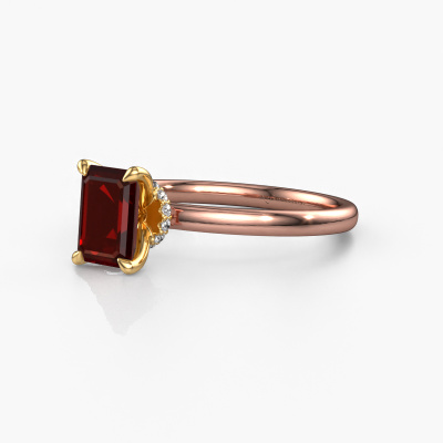 The ring shown above is called the Crystal EME 3, we call this a solitaire ring because it contains a single gemstone. The engagement ring is made in 14 Carat rose gold and has a emerald cut garnet of 7x5 mm. This classic rose gold solitaire ring with exquisite emerald cut garnet is a beautiful engagement ring. The open prong setting allows light to strike the gemstone from various angles. The ring also stands out because of the high positioning of the gemstone. Because diamonds symbolize true love and purity, they make the perfect gift for the love of your life. The symbol of eternal love is the centerpiece of this solitaire ring. Like a diamond, all other types of precious metal have their own attributed symbolic meaning. You can compile the solitaire engagement ring yourself in various precious metal combinations. This one has the combination of 14 Carat rose gold with gold. Each piece of jewelry is made by a team of passionate goldsmiths and jewel designers. This will make your crown jewel truly eye-catching.By using our modern techniques, we can design and customize the finest quality jewels with the utmost care for you. Our engagement rings are always priced 30 percent lower than other jewellers. We make engagement rings to order so we don't have to maintain a large stock. If you have a certain budget, we are more than happy to advice you accordingly.Do you have a specific ring in mind? One you came across somewhere. Please feel free to tell us your wishes and we will turn your design into a unique engagement ring. You can follow the development of your ring design because we use 3D drawings. This gives you a realistic preview of your design. We will gladly send you a non-binding offer, based on a fair price/ quality ratio. It will amaze you.To make it easier for you, we offer a 30 day return policy. Check our terms and conditions.