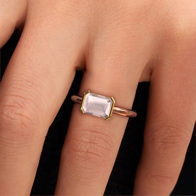The ring shown above is called the Tayler EME, we call this a solitaire ring because it contains a single gemstone. The engagement ring is made in 14 Carat rose gold and has a emerald cut morganite champagne of 8x6 mm. This modern rose gold solitaire ring with exquisite emerald cut morganite champagne is a beautiful engagement ring. The open prong setting allows light to strike the gemstone from various angles. The ring also stands out because of the high positioning of the gemstone. Because diamonds symbolize true love and purity, they make the perfect gift for the love of your life. The symbol of eternal love is the centerpiece of this solitaire ring. Like a diamond, all other types of precious metal have their own attributed symbolic meaning. You can compile the solitaire engagement ring yourself in various precious metal combinations. This one has the combination of 14 Carat rose gold with gold. Each piece of jewelry is created to add sparkle to your finger, each jewel is lovingly made by hand by our goldsmiths.After receiving your order, our goldsmiths will passionately start the creative process of making your engagement ring in our own studio. Because we don't have a big stockpile, these costs will not be passed on to you. Our pricing is proof of that! We offer top quality jewels at lowest price, guaranteed.Our designers and goldsmiths work together each day, creating new jewels. Perhaps you have found a nice modern engagement ring somewhere, which can be used to customize your unique ring. Please feel free to contact us. We will make you an offer, based on a fair price/ quality ratio, which will amaze you.To make it easier for you, we offer a 30 day return policy. Check our terms and conditions.