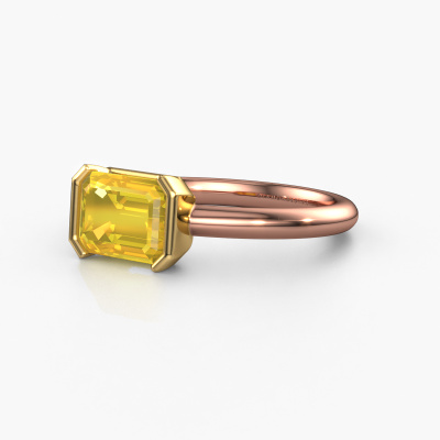 The ring shown above is called the Tayler EME, we call this a solitaire ring because it contains a single gemstone. The engagement ring is made in 14 Carat rose gold and has a emerald cut yellow sapphire of 8x6 mm. This modern rose gold solitaire ring with exquisite emerald cut yellow sapphire is a beautiful engagement ring. The open prong setting allows light to strike the gemstone from various angles. The ring also stands out because of the high positioning of the gemstone. Because diamonds symbolize true love and purity, they make the perfect gift for the love of your life. The symbol of eternal love is the centerpiece of this solitaire ring. Like a diamond, all other types of precious metal have their own attributed symbolic meaning. You can compile the solitaire engagement ring yourself in various precious metal combinations. This one has the combination of 14 Carat rose gold with gold. Each piece of jewelry is created to add sparkle to your finger, each jewel is lovingly made by hand by our goldsmiths.After receiving your order, our goldsmiths will passionately start the creative process of making your engagement ring in our own studio. Because we don't have a big stockpile, these costs will not be passed on to you. Our pricing is proof of that! We offer top quality jewels at lowest price, guaranteed.Our designers and goldsmiths work together each day, creating new jewels. Perhaps you have found a nice modern engagement ring somewhere, which can be used to customize your unique ring. Please feel free to contact us. We will make you an offer, based on a fair price/ quality ratio, which will amaze you.To make it easier for you, we offer a 30 day return policy. Check our terms and conditions.