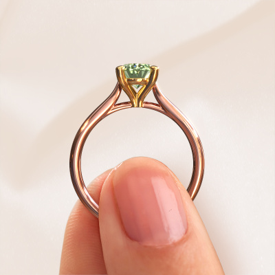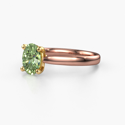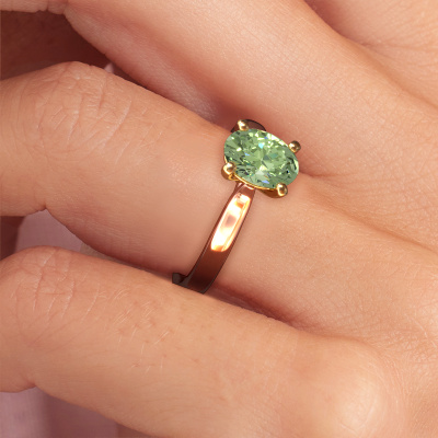 The ring shown above is called the Mignon ovl 1, we call this a solitaire ring because it contains a single gemstone. The engagement ring is made in 14 Carat rose gold and has a oval green lab grown diamond of 8x6 mm. This traditional rose gold solitaire ring with exquisite oval green lab grown diamond is a beautiful engagement ring. The open prong setting allows light to strike the gemstone from various angles. The ring also stands out because of the high positioning of the gemstone. Because diamonds symbolize true love and purity, they make the perfect gift for the love of your life. The symbol of eternal love is the centerpiece of this solitaire ring. Like a diamond, all other types of precious metal have their own attributed symbolic meaning. You can compile the solitaire engagement ring yourself in various precious metal combinations. This one has the combination of 14 Carat rose gold with gold. Each piece of jewelry is made by a team of passionate goldsmiths and jewel designers. This will make your crown jewel truly eye-catching.By using a combination of the latest modern techniques, combined with ancient crafting, we can make all our engagement rings in our own studio. Each jewel is made to order. This is advantageous because we can offer you a price you won't find anywhere else.Our designers and goldsmiths work together each day, creating new jewels. Perhaps you have found a nice traditional engagement ring somewhere, which can be used to customize your unique ring. Please feel free to contact us. We will make you an offer, based on a fair price/ quality ratio, which will amaze you.To make it easier for you, we offer a 30 day return policy. Check our terms and conditions.