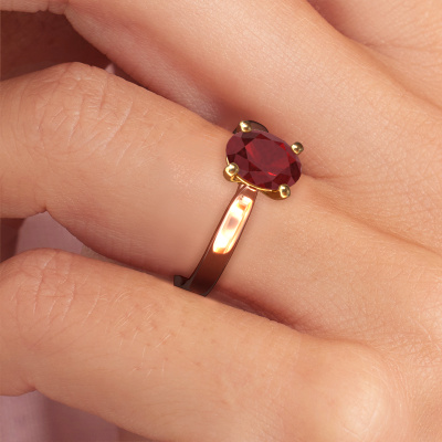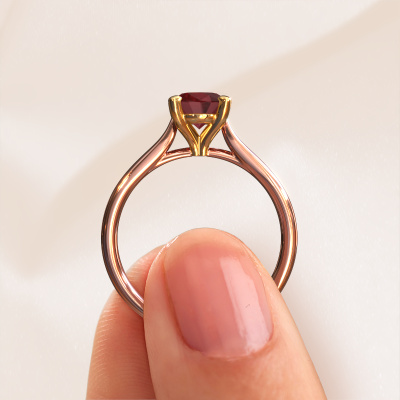 The ring shown above is called the Mignon ovl 1, we call this a solitaire ring because it contains a single gemstone. The engagement ring is made in 14 Carat rose gold and has a oval ruby of 8x6 mm. This traditional rose gold solitaire ring with exquisite oval ruby is a beautiful engagement ring. The open prong setting allows light to strike the gemstone from various angles. The ring also stands out because of the high positioning of the gemstone. Because diamonds symbolize true love and purity, they make the perfect gift for the love of your life. The symbol of eternal love is the centerpiece of this solitaire ring. Like a diamond, all other types of precious metal have their own attributed symbolic meaning. You can compile the solitaire engagement ring yourself in various precious metal combinations. This one has the combination of 14 Carat rose gold with gold. Each piece of jewelry is made by a team of passionate goldsmiths and jewel designers. This will make your crown jewel truly eye-catching.By using a combination of the latest modern techniques, combined with ancient crafting, we can make all our engagement rings in our own studio. Each jewel is made to order. This is advantageous because we can offer you a price you won't find anywhere else.Our designers and goldsmiths work together each day, creating new jewels. Perhaps you have found a nice traditional engagement ring somewhere, which can be used to customize your unique ring. Please feel free to contact us. We will make you an offer, based on a fair price/ quality ratio, which will amaze you.To make it easier for you, we offer a 30 day return policy. Check our terms and conditions.