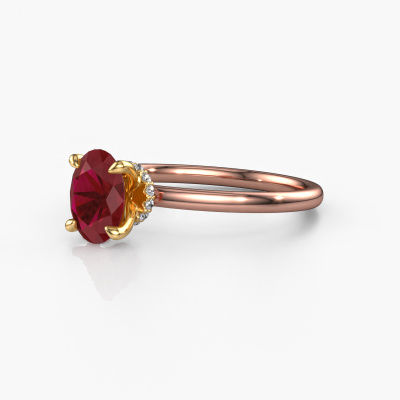 The ring shown above is called the Crystal OVL 3, we call this a solitaire ring because it contains a single gemstone. The engagement ring is made in 14 Carat rose gold and has a oval ruby of 7,5x5,5 mm. This unique rose gold solitaire ring with exquisite oval ruby is a beautiful engagement ring. The open prong setting allows light to strike the gemstone from various angles. The ring also stands out because of the high positioning of the gemstone. Because diamonds symbolize true love and purity, they make the perfect gift for the love of your life. The symbol of eternal love is the centerpiece of this solitaire ring. Like a diamond, all other types of precious metal have their own attributed symbolic meaning. You can compile the solitaire engagement ring yourself in various precious metal combinations. This one has the combination of 14 Carat rose gold with gold. Each piece of jewelry is made just for you by our master goldsmiths in our own studio.After receiving your order, our goldsmiths will passionately start the creative process of making your engagement ring in our own studio. Because we don't have a big stockpile, these costs will not be passed on to you. Our pricing is proof of that! We offer top quality jewels at lowest price, guaranteed.Our designers and goldsmiths work together each day, creating new jewels. Perhaps you have found a nice unique engagement ring somewhere, which can be used to customize your unique ring. Please feel free to contact us. We will make you an offer, based on a fair price/ quality ratio, which will amaze you.To make it easier for you, we offer a 30 day return policy. Check our terms and conditions.