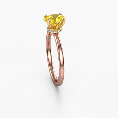 The ring shown above is called the Crystal OVL 3, we call this a solitaire ring because it contains a single gemstone. The engagement ring is made in 14 Carat rose gold and has a oval yellow sapphire of 7,5x5,5 mm. This unique rose gold solitaire ring with exquisite oval yellow sapphire is a beautiful engagement ring. The open prong setting allows light to strike the gemstone from various angles. The ring also stands out because of the high positioning of the gemstone. Because diamonds symbolize true love and purity, they make the perfect gift for the love of your life. The symbol of eternal love is the centerpiece of this solitaire ring. Like a diamond, all other types of precious metal have their own attributed symbolic meaning. You can compile the solitaire engagement ring yourself in various precious metal combinations. This one has the combination of 14 Carat rose gold with gold. Each piece of jewelry is made just for you by our master goldsmiths in our own studio.After receiving your order, our goldsmiths will passionately start the creative process of making your engagement ring in our own studio. Because we don't have a big stockpile, these costs will not be passed on to you. Our pricing is proof of that! We offer top quality jewels at lowest price, guaranteed.Our designers and goldsmiths work together each day, creating new jewels. Perhaps you have found a nice unique engagement ring somewhere, which can be used to customize your unique ring. Please feel free to contact us. We will make you an offer, based on a fair price/ quality ratio, which will amaze you.To make it easier for you, we offer a 30 day return policy. Check our terms and conditions.