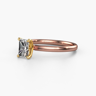 The ring shown above is called the Crystal RAD 1, we call this a solitaire ring because it contains a single gemstone. The engagement ring is made in 14 Carat rose gold and has a radiant diamond of 0.65 crt. This modern rose gold solitaire ring with exquisite radiant diamond is a beautiful engagement ring. The open prong setting allows light to strike the gemstone from various angles. The ring also stands out because of the high positioning of the gemstone. Because diamonds symbolize true love and purity, they make the perfect gift for the love of your life. The symbol of eternal love is the centerpiece of this solitaire ring. Like a diamond, all other types of precious metal have their own attributed symbolic meaning. You can compile the solitaire engagement ring yourself in various precious metal combinations. This one has the combination of 14 Carat rose gold with gold. Each piece of jewelry is made by a team of passionate goldsmiths and jewel designers. This will make your crown jewel truly eye-catching.After receiving your order, our goldsmiths will passionately start the creative process of making your engagement ring in our own studio. Because we don't have a big stockpile, these costs will not be passed on to you. Our pricing is proof of that! We offer top quality jewels at lowest price, guaranteed.Have you found a specific engagement ring somewhere which you would like to give to your loved one? Please feel free to express your wishes to our jewel designers because we would be honoured to turn your design into a modern engagement ring. You can follow the development of your ring design because we use 3D drawings. This gives you a realistic preview of how your design will look. You can also preorder a dummy. A dummy is a plastic ring, which can be shaped according your ring design. You can try it on and check if its width and size are suitable for you. We will gladly send you a non-binding offer, based on a fair price/ quality ratio. It will amaze you, considering the quality of the ring and gemstones.To make it easier for you, we offer a 30 day return policy. Check our terms and conditions.