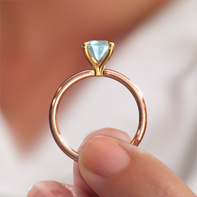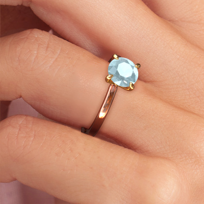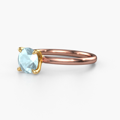 The ring shown above is called the Crystal RND 1, we call this a solitaire ring because it contains a single gemstone. The engagement ring is made in 14 Carat rose gold and has a round aquamarine of 6.8 mm. This classic rose gold solitaire ring with exquisite round aquamarine is a beautiful engagement ring. The open prong setting allows light to strike the gemstone from various angles. The ring also stands out because of the high positioning of the gemstone. Because diamonds symbolize true love and purity, they make the perfect gift for the love of your life. The symbol of eternal love is the centerpiece of this solitaire ring. Like a diamond, all other types of precious metal have their own attributed symbolic meaning. You can compile the solitaire engagement ring yourself in various precious metal combinations. This one has the combination of 14 Carat rose gold with gold. Each piece of jewelry is made by a team of passionate goldsmiths and jewel designers. This will make your crown jewel truly eye-catching.After receiving your order, our goldsmiths will passionately start the creative process of making your engagement ring in our own studio. Because we don't have a big stockpile, these costs will not be passed on to you. Our pricing is proof of that! We offer top quality jewels at lowest price, guaranteed.Do you have a specific ring in mind? One you came across somewhere. Please feel free to tell us your wishes and we will turn your design into a unique engagement ring. You can follow the development of your ring design because we use 3D drawings. This gives you a realistic preview of your design. We will gladly send you a non-binding offer, based on a fair price/ quality ratio. It will amaze you.To make it easier for you, we offer a 30 day return policy. Check our terms and conditions.