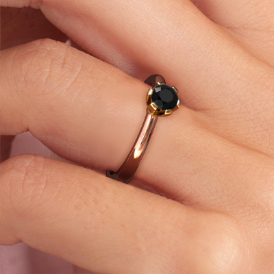 The ring shown above is called the Julia, we call this a solitaire ring because it contains a single gemstone. The engagement ring is made in 14 Carat rose gold and has a round black diamond of 0.30 crt. This trendy rose gold solitaire ring with exquisite round black diamond is a beautiful engagement ring. The open prong setting allows light to strike the gemstone from various angles. The ring also stands out because of the high positioning of the gemstone. Because diamonds symbolize true love and purity, they make the perfect gift for the love of your life. The symbol of eternal love is the centerpiece of this solitaire ring. Like a diamond, all other types of precious metal have their own attributed symbolic meaning. You can compile the solitaire engagement ring yourself in various precious metal combinations. This one has the combination of 14 Carat rose gold with gold. Each piece of jewelry is created to add sparkle to your finger, each jewel is lovingly made by hand by our goldsmiths.Are you on a budget? Please feel free to contact us, so we can go discuss your options. We offer our engagement rings at guaranteed best price, because we make them to order. You won't find such a price anywhere else!Different styles of new rings are made daily by our team. Perhaps you have found a solitaire engagement ring somewhere. One you would like to give to your loved one. Please feel free to share your thoughts and design with our jewel designers. We would love to turn your design into a trendy engagement ring. You can follow the development of your ring design because we use very detailed 3D drawings. On top of that, you can order a dummy of the design. A dummy is a plastic ring, which can be shaped according your ring design. You can try it on and check if the engagement ring is up to standard. We will gladly send you a non-binding offer, based on a fair price/ quality ratio. The offer will baffle you, considering the quality of the ring and gemstones.To make it easier for you, we offer a 30 day return policy. Check our terms and conditions.