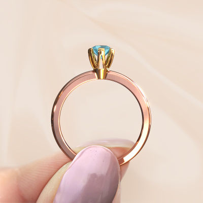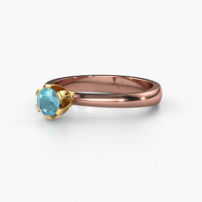 The ring shown above is called the Julia, we call this a solitaire ring because it contains a single gemstone. The engagement ring is made in 14 Carat rose gold and has a round blue topaz of 4 mm. This trendy rose gold solitaire ring with exquisite round blue topaz is a beautiful engagement ring. The open prong setting allows light to strike the gemstone from various angles. The ring also stands out because of the high positioning of the gemstone. Because diamonds symbolize true love and purity, they make the perfect gift for the love of your life. The symbol of eternal love is the centerpiece of this solitaire ring. Like a diamond, all other types of precious metal have their own attributed symbolic meaning. You can compile the solitaire engagement ring yourself in various precious metal combinations. This one has the combination of 14 Carat rose gold with gold. Each piece of jewelry is created to add sparkle to your finger, each jewel is lovingly made by hand by our goldsmiths.Are you on a budget? Please feel free to contact us, so we can go discuss your options. We offer our engagement rings at guaranteed best price, because we make them to order. You won't find such a price anywhere else!Different styles of new rings are made daily by our team. Perhaps you have found a solitaire engagement ring somewhere. One you would like to give to your loved one. Please feel free to share your thoughts and design with our jewel designers. We would love to turn your design into a trendy engagement ring. You can follow the development of your ring design because we use very detailed 3D drawings. On top of that, you can order a dummy of the design. A dummy is a plastic ring, which can be shaped according your ring design. You can try it on and check if the engagement ring is up to standard. We will gladly send you a non-binding offer, based on a fair price/ quality ratio. The offer will baffle you, considering the quality of the ring and gemstones.To make it easier for you, we offer a 30 day return policy. Check our terms and conditions.