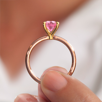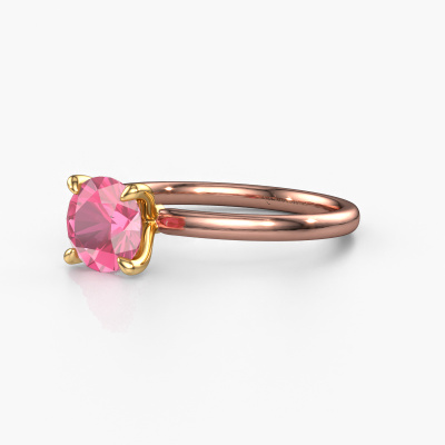 The ring shown above is called the Crystal RND 1, we call this a solitaire ring because it contains a single gemstone. The engagement ring is made in 14 Carat rose gold and has a round pink sapphire of 6.8 mm. This classic rose gold solitaire ring with exquisite round pink sapphire is a beautiful engagement ring. The open prong setting allows light to strike the gemstone from various angles. The ring also stands out because of the high positioning of the gemstone. Because diamonds symbolize true love and purity, they make the perfect gift for the love of your life. The symbol of eternal love is the centerpiece of this solitaire ring. Like a diamond, all other types of precious metal have their own attributed symbolic meaning. You can compile the solitaire engagement ring yourself in various precious metal combinations. This one has the combination of 14 Carat rose gold with gold. Each piece of jewelry is made by a team of passionate goldsmiths and jewel designers. This will make your crown jewel truly eye-catching.After receiving your order, our goldsmiths will passionately start the creative process of making your engagement ring in our own studio. Because we don't have a big stockpile, these costs will not be passed on to you. Our pricing is proof of that! We offer top quality jewels at lowest price, guaranteed.Do you have a specific ring in mind? One you came across somewhere. Please feel free to tell us your wishes and we will turn your design into a unique engagement ring. You can follow the development of your ring design because we use 3D drawings. This gives you a realistic preview of your design. We will gladly send you a non-binding offer, based on a fair price/ quality ratio. It will amaze you.To make it easier for you, we offer a 30 day return policy. Check our terms and conditions.