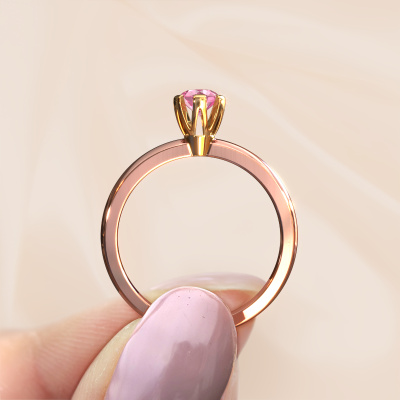 The ring shown above is called the Julia, we call this a solitaire ring because it contains a single gemstone. The engagement ring is made in 14 Carat rose gold and has a round pink sapphire of 4 mm. This trendy rose gold solitaire ring with exquisite round pink sapphire is a beautiful engagement ring. The open prong setting allows light to strike the gemstone from various angles. The ring also stands out because of the high positioning of the gemstone. Because diamonds symbolize true love and purity, they make the perfect gift for the love of your life. The symbol of eternal love is the centerpiece of this solitaire ring. Like a diamond, all other types of precious metal have their own attributed symbolic meaning. You can compile the solitaire engagement ring yourself in various precious metal combinations. This one has the combination of 14 Carat rose gold with gold. Each piece of jewelry is created to add sparkle to your finger, each jewel is lovingly made by hand by our goldsmiths.Are you on a budget? Please feel free to contact us, so we can go discuss your options. We offer our engagement rings at guaranteed best price, because we make them to order. You won't find such a price anywhere else!Different styles of new rings are made daily by our team. Perhaps you have found a solitaire engagement ring somewhere. One you would like to give to your loved one. Please feel free to share your thoughts and design with our jewel designers. We would love to turn your design into a trendy engagement ring. You can follow the development of your ring design because we use very detailed 3D drawings. On top of that, you can order a dummy of the design. A dummy is a plastic ring, which can be shaped according your ring design. You can try it on and check if the engagement ring is up to standard. We will gladly send you a non-binding offer, based on a fair price/ quality ratio. The offer will baffle you, considering the quality of the ring and gemstones.To make it easier for you, we offer a 30 day return policy. Check our terms and conditions.