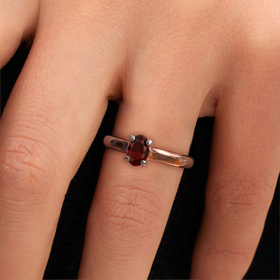 The ring shown above is called the Valorie ovl 1, we call this a solitaire ring because it contains a single gemstone. The engagement ring is made in 14 Carat rose gold and has a oval garnet of 6.5x4.5 mm. This modern rose gold solitaire ring with exquisite oval garnet is a beautiful engagement ring. The open prong setting allows light to strike the gemstone from various angles. The ring also stands out because of the high positioning of the gemstone. Because diamonds symbolize true love and purity, they make the perfect gift for the love of your life. The symbol of eternal love is the centerpiece of this solitaire ring. Like a diamond, all other types of precious metal have their own attributed symbolic meaning. You can compile the solitaire engagement ring yourself in various precious metal combinations. This one has the combination of 14 Carat rose gold with white gold. Each piece of jewelry is made just for you, with attention to detail and design.By using our modern techniques, we can design and customize the finest quality jewels with the utmost care for you. Our engagement rings are always priced 30 percent lower than other jewellers. We make engagement rings to order so we don't have to maintain a large stock. If you have a certain budget, we are more than happy to advice you accordingly.Do you have a specific ring in mind? One you came across somewhere. Please feel free to tell us your wishes and we will turn your design into a unique engagement ring. You can follow the development of your ring design because we use 3D drawings. This gives you a realistic preview of your design. We will gladly send you a non-binding offer, based on a fair price/ quality ratio. It will amaze you.To make it easier for you, we offer a 30 day return policy. Check our terms and conditions.