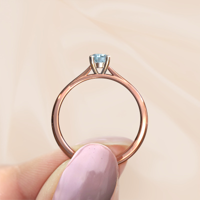 The ring shown above is called the Sam, we call this a solitaire ring because it contains a single gemstone. The engagement ring is made in 14 Carat rose gold and has a round blue lab grown diamond of 4.2 mm. This classic rose gold solitaire ring with exquisite round blue lab grown diamond is a beautiful engagement ring. The open prong setting allows light to strike the gemstone from various angles. The ring also stands out because of the high positioning of the gemstone. Because diamonds symbolize true love and purity, they make the perfect gift for the love of your life. The symbol of eternal love is the centerpiece of this solitaire ring. Like a diamond, all other types of precious metal have their own attributed symbolic meaning. You can compile the solitaire engagement ring yourself in various precious metal combinations. This one has the combination of 14 Carat rose gold with white gold. Each piece of jewelry is made just for you, with attention to detail and design.