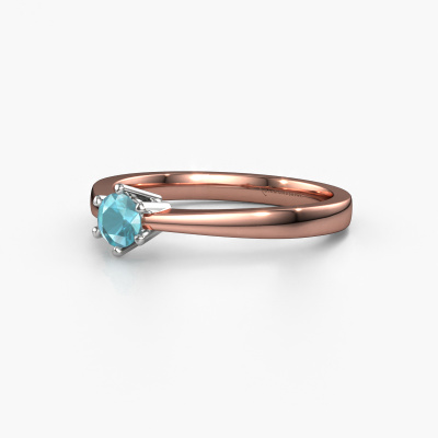 The ring shown above is called the Noortje, we call this a solitaire ring because it contains a single gemstone. The engagement ring is made in 14 Carat rose gold and has a round blue topaz of 4 mm. This classic rose gold solitaire ring with exquisite round blue topaz is a beautiful engagement ring. The open prong setting allows light to strike the gemstone from various angles. The ring also stands out because of the high positioning of the gemstone. Because diamonds symbolize true love and purity, they make the perfect gift for the love of your life. The symbol of eternal love is the centerpiece of this solitaire ring. Like a diamond, all other types of precious metal have their own attributed symbolic meaning. You can compile the solitaire engagement ring yourself in various precious metal combinations. This one has the combination of 14 Carat rose gold with white gold. Each piece of jewelry is made by a team of passionate goldsmiths and jewel designers. This will make your crown jewel truly eye-catching.By using a combination of the latest modern techniques, combined with ancient crafting, we can make all our engagement rings in our own studio. Each jewel is made to order. This is advantageous because we can offer you a price you won't find anywhere else.Our team adds new designs to our online collection daily. Our designers and goldsmiths work together in creating the best design. We strive to offer a diverse collection of jewels. Perhaps you have a specific jewel design in mind. One you came across somewhere. Please contact us for a free consultation. We will make you an offer, based on a fair price/ quality ratio, that will baffle you.To make it easier for you, we offer a 30 day return policy. Check our terms and conditions.