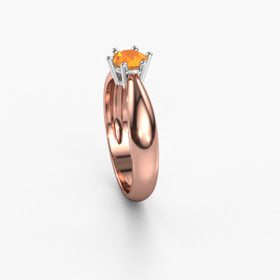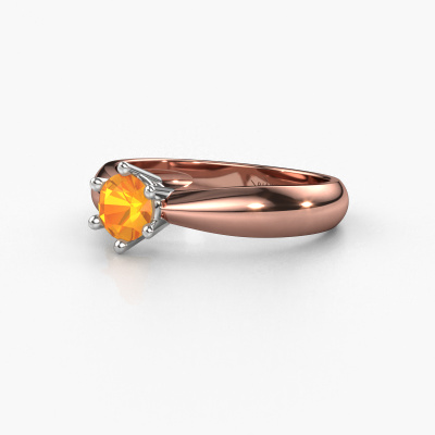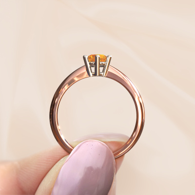 The ring shown above is called the Fay, we call this a solitaire ring because it contains a single gemstone. The engagement ring is made in 14 Carat rose gold and has a round citrin of 5 mm. This traditional rose gold solitaire ring with exquisite round citrin is a beautiful engagement ring. The open prong setting allows light to strike the gemstone from various angles. The ring also stands out because of the high positioning of the gemstone. Because diamonds symbolize true love and purity, they make the perfect gift for the love of your life. The symbol of eternal love is the centerpiece of this solitaire ring. Like a diamond, all other types of precious metal have their own attributed symbolic meaning. You can compile the solitaire engagement ring yourself in various precious metal combinations. This one has the combination of 14 Carat rose gold with white gold. Each piece of jewelry is made just for you by our master goldsmiths in our own studio.By using a combination of the latest modern techniques, combined with ancient crafting, we can make all our engagement rings in our own studio. Each jewel is made to order. This is advantageous because we can offer you a price you won't find anywhere else.Have you found a specific engagement ring somewhere which you would like to give to your loved one? Please feel free to express your wishes to our jewel designers because we would be honoured to turn your design into a traditional engagement ring. You can follow the development of your ring design because we use 3D drawings. This gives you a realistic preview of how your design will look. You can also preorder a dummy. A dummy is a plastic ring, which can be shaped according your ring design. You can try it on and check if its width and size are suitable for you. We will gladly send you a non-binding offer, based on a fair price/ quality ratio. It will amaze you, considering the quality of the ring and gemstones.To make it easier for you, we offer a 30 day return policy. Check our terms and conditions.