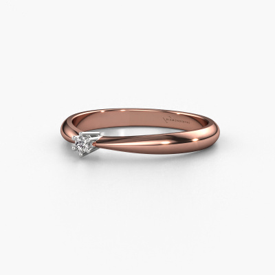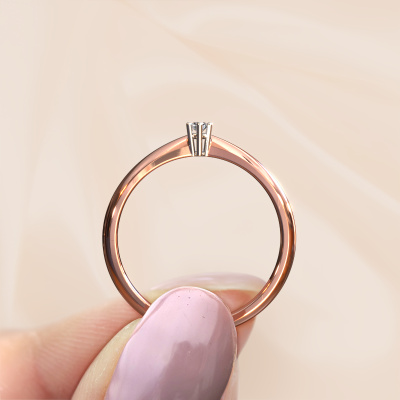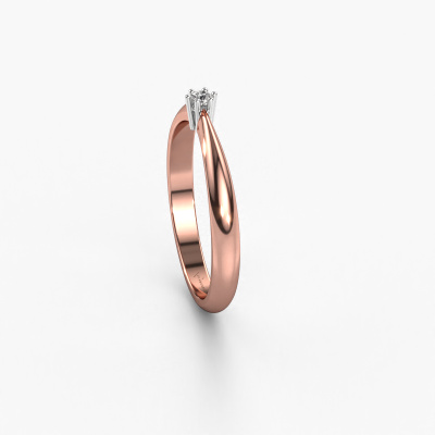The ring shown above is called the Fay, we call this a solitaire ring because it contains a single gemstone. The engagement ring is made in 14 Carat rose gold and has a round diamond of 0.03 crt. This traditional rose gold solitaire ring with exquisite round diamond is a beautiful engagement ring. The open prong setting allows light to strike the gemstone from various angles. The ring also stands out because of the high positioning of the gemstone. Because diamonds symbolize true love and purity, they make the perfect gift for the love of your life. The symbol of eternal love is the centerpiece of this solitaire ring. Like a diamond, all other types of precious metal have their own attributed symbolic meaning. You can compile the solitaire engagement ring yourself in various precious metal combinations. This one has the combination of 14 Carat rose gold with white gold. Each piece of jewelry is made just for you by our master goldsmiths in our own studio.By using a combination of the latest modern techniques, combined with ancient crafting, we can make all our engagement rings in our own studio. Each jewel is made to order. This is advantageous because we can offer you a price you won't find anywhere else.Have you found a specific engagement ring somewhere which you would like to give to your loved one? Please feel free to express your wishes to our jewel designers because we would be honoured to turn your design into a traditional engagement ring. You can follow the development of your ring design because we use 3D drawings. This gives you a realistic preview of how your design will look. You can also preorder a dummy. A dummy is a plastic ring, which can be shaped according your ring design. You can try it on and check if its width and size are suitable for you. We will gladly send you a non-binding offer, based on a fair price/ quality ratio. It will amaze you, considering the quality of the ring and gemstones.To make it easier for you, we offer a 30 day return policy. Check our terms and conditions.