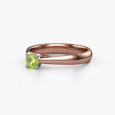 The ring shown above is called the Sam, we call this a solitaire ring because it contains a single gemstone. The engagement ring is made in 14 Carat rose gold and has a round peridot of 4.2 mm. This classic rose gold solitaire ring with exquisite round peridot is a beautiful engagement ring. The open prong setting allows light to strike the gemstone from various angles. The ring also stands out because of the high positioning of the gemstone. Because diamonds symbolize true love and purity, they make the perfect gift for the love of your life. The symbol of eternal love is the centerpiece of this solitaire ring. Like a diamond, all other types of precious metal have their own attributed symbolic meaning. You can compile the solitaire engagement ring yourself in various precious metal combinations. This one has the combination of 14 Carat rose gold with white gold. Each piece of jewelry is made just for you, with attention to detail and design.After receiving your order, our goldsmiths will passionately start the creative process of making your engagement ring in our own studio. Because we don't have a big stockpile, these costs will not be passed on to you. Our pricing is proof of that! We offer top quality jewels at lowest price, guaranteed.Our team adds new designs to our online collection daily. Our designers and goldsmiths work together in creating the best design. We strive to offer a diverse collection of jewels. Perhaps you have a specific jewel design in mind. One you came across somewhere. Please contact us for a free consultation. We will make you an offer, based on a fair price/ quality ratio, that will baffle you.To make it easier for you, we offer a 30 day return policy. Check our terms and conditions.