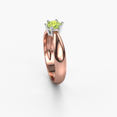 The ring shown above is called the Fay, we call this a solitaire ring because it contains a single gemstone. The engagement ring is made in 14 Carat rose gold and has a round peridot of 5 mm. This traditional rose gold solitaire ring with exquisite round peridot is a beautiful engagement ring. The open prong setting allows light to strike the gemstone from various angles. The ring also stands out because of the high positioning of the gemstone. Because diamonds symbolize true love and purity, they make the perfect gift for the love of your life. The symbol of eternal love is the centerpiece of this solitaire ring. Like a diamond, all other types of precious metal have their own attributed symbolic meaning. You can compile the solitaire engagement ring yourself in various precious metal combinations. This one has the combination of 14 Carat rose gold with white gold. Each piece of jewelry is made just for you by our master goldsmiths in our own studio.By using a combination of the latest modern techniques, combined with ancient crafting, we can make all our engagement rings in our own studio. Each jewel is made to order. This is advantageous because we can offer you a price you won't find anywhere else.Have you found a specific engagement ring somewhere which you would like to give to your loved one? Please feel free to express your wishes to our jewel designers because we would be honoured to turn your design into a traditional engagement ring. You can follow the development of your ring design because we use 3D drawings. This gives you a realistic preview of how your design will look. You can also preorder a dummy. A dummy is a plastic ring, which can be shaped according your ring design. You can try it on and check if its width and size are suitable for you. We will gladly send you a non-binding offer, based on a fair price/ quality ratio. It will amaze you, considering the quality of the ring and gemstones.To make it easier for you, we offer a 30 day return policy. Check our terms and conditions.