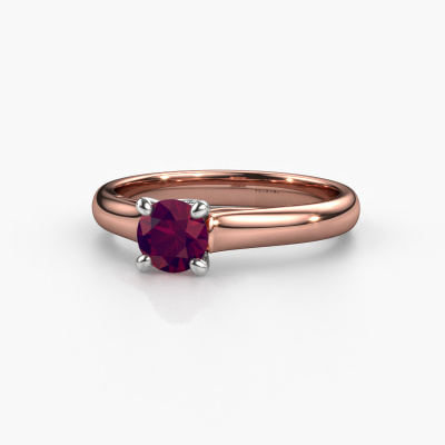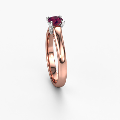 The ring shown above is called the Valorie RND 1, we call this a solitaire ring because it contains a single gemstone. The engagement ring is made in 14 Carat rose gold and has a round rhodolite of 5 mm. This modern rose gold solitaire ring with exquisite round rhodolite is a beautiful engagement ring. The open prong setting allows light to strike the gemstone from various angles. The ring also stands out because of the high positioning of the gemstone. Because diamonds symbolize true love and purity, they make the perfect gift for the love of your life. The symbol of eternal love is the centerpiece of this solitaire ring. Like a diamond, all other types of precious metal have their own attributed symbolic meaning. You can compile the solitaire engagement ring yourself in various precious metal combinations. This one has the combination of 14 Carat rose gold with white gold. Each piece of jewelry is made just for you, with attention to detail and design.By using our modern techniques, we can design and customize the finest quality jewels with the utmost care for you. Our engagement rings are always priced 30 percent lower than other jewellers. We make engagement rings to order so we don't have to maintain a large stock. If you have a certain budget, we are more than happy to advice you accordingly.Do you have a specific ring in mind? One you came across somewhere. Please feel free to tell us your wishes and we will turn your design into a unique engagement ring. You can follow the development of your ring design because we use 3D drawings. This gives you a realistic preview of your design. We will gladly send you a non-binding offer, based on a fair price/ quality ratio. It will amaze you.To make it easier for you, we offer a 30 day return policy. Check our terms and conditions.