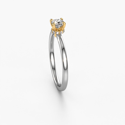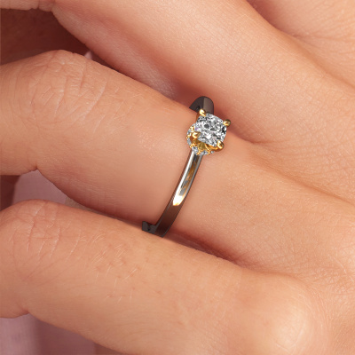 The ring shown above is called the Crystal CUS 3, we call this a solitaire ring because it contains a single gemstone. The engagement ring is made in 14 Carat white gold and has a cushion diamond of 0.33 crt. This fashionable white gold solitaire ring with exquisite cushion diamond is a beautiful engagement ring. The open prong setting allows light to strike the gemstone from various angles. The ring also stands out because of the high positioning of the gemstone. Because diamonds symbolize true love and purity, they make the perfect gift for the love of your life. The symbol of eternal love is the centerpiece of this solitaire ring. Like a diamond, all other types of precious metal have their own attributed symbolic meaning. You can compile the solitaire engagement ring yourself in various precious metal combinations. This one has the combination of 14 Carat white gold with gold. Each piece of jewelry is made by a team of passionate goldsmiths and jewel designers. This will make your crown jewel truly eye-catching.By using a combination of the latest modern techniques, combined with ancient crafting, we can make all our engagement rings in our own studio. Each jewel is made to order. This is advantageous because we can offer you a price you won't find anywhere else.Our designers and goldsmiths work together each day, creating new jewels. Perhaps you have found a nice fashionable engagement ring somewhere, which can be used to customize your unique ring. Please feel free to contact us. We will make you an offer, based on a fair price/ quality ratio, which will amaze you.To make it easier for you, we offer a 30 day return policy. Check our terms and conditions.