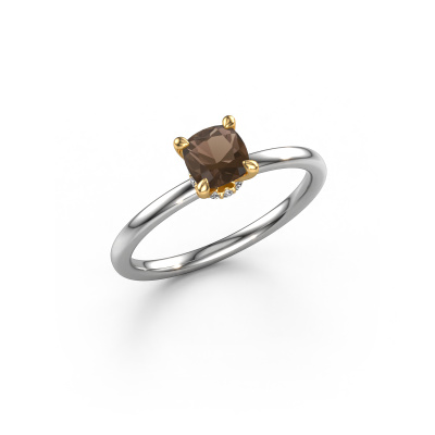 The ring shown above is called the Crystal CUS 3, we call this a solitaire ring because it contains a single gemstone. The engagement ring is made in 14 Carat white gold and has a cushion smokey quartz of 5 mm. This fashionable white gold solitaire ring with exquisite cushion smokey quartz is a beautiful engagement ring. The open prong setting allows light to strike the gemstone from various angles. The ring also stands out because of the high positioning of the gemstone. Because diamonds symbolize true love and purity, they make the perfect gift for the love of your life. The symbol of eternal love is the centerpiece of this solitaire ring. Like a diamond, all other types of precious metal have their own attributed symbolic meaning. You can compile the solitaire engagement ring yourself in various precious metal combinations. This one has the combination of 14 Carat white gold with gold. Each piece of jewelry is made by a team of passionate goldsmiths and jewel designers. This will make your crown jewel truly eye-catching.By using a combination of the latest modern techniques, combined with ancient crafting, we can make all our engagement rings in our own studio. Each jewel is made to order. This is advantageous because we can offer you a price you won't find anywhere else.Our designers and goldsmiths work together each day, creating new jewels. Perhaps you have found a nice fashionable engagement ring somewhere, which can be used to customize your unique ring. Please feel free to contact us. We will make you an offer, based on a fair price/ quality ratio, which will amaze you.To make it easier for you, we offer a 30 day return policy. Check our terms and conditions.