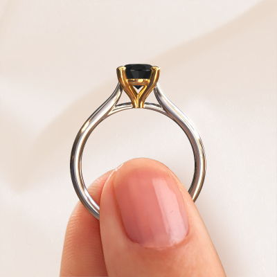 The ring shown above is called the Mignon ovl 1, we call this a solitaire ring because it contains a single gemstone. The engagement ring is made in 14 Carat white gold and has a oval black diamond of 1.40 crt. This traditional white gold solitaire ring with exquisite oval black diamond is a beautiful engagement ring. The open prong setting allows light to strike the gemstone from various angles. The ring also stands out because of the high positioning of the gemstone. Because diamonds symbolize true love and purity, they make the perfect gift for the love of your life. The symbol of eternal love is the centerpiece of this solitaire ring. Like a diamond, all other types of precious metal have their own attributed symbolic meaning. You can compile the solitaire engagement ring yourself in various precious metal combinations. This one has the combination of 14 Carat white gold with gold. Each piece of jewelry is made by a team of passionate goldsmiths and jewel designers. This will make your crown jewel truly eye-catching.By using a combination of the latest modern techniques, combined with ancient crafting, we can make all our engagement rings in our own studio. Each jewel is made to order. This is advantageous because we can offer you a price you won't find anywhere else.Our designers and goldsmiths work together each day, creating new jewels. Perhaps you have found a nice traditional engagement ring somewhere, which can be used to customize your unique ring. Please feel free to contact us. We will make you an offer, based on a fair price/ quality ratio, which will amaze you.To make it easier for you, we offer a 30 day return policy. Check our terms and conditions.