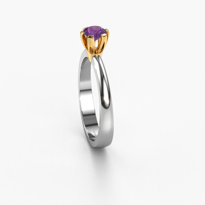 The ring shown above is called the Julia, we call this a solitaire ring because it contains a single gemstone. The engagement ring is made in 14 Carat white gold and has a round amethyst of 4 mm. This trendy white gold solitaire ring with exquisite round amethyst is a beautiful engagement ring. The open prong setting allows light to strike the gemstone from various angles. The ring also stands out because of the high positioning of the gemstone. Because diamonds symbolize true love and purity, they make the perfect gift for the love of your life. The symbol of eternal love is the centerpiece of this solitaire ring. Like a diamond, all other types of precious metal have their own attributed symbolic meaning. You can compile the solitaire engagement ring yourself in various precious metal combinations. This one has the combination of 14 Carat white gold with gold. Each piece of jewelry is created to add sparkle to your finger, each jewel is lovingly made by hand by our goldsmiths.Are you on a budget? Please feel free to contact us, so we can go discuss your options. We offer our engagement rings at guaranteed best price, because we make them to order. You won't find such a price anywhere else!Different styles of new rings are made daily by our team. Perhaps you have found a solitaire engagement ring somewhere. One you would like to give to your loved one. Please feel free to share your thoughts and design with our jewel designers. We would love to turn your design into a trendy engagement ring. You can follow the development of your ring design because we use very detailed 3D drawings. On top of that, you can order a dummy of the design. A dummy is a plastic ring, which can be shaped according your ring design. You can try it on and check if the engagement ring is up to standard. We will gladly send you a non-binding offer, based on a fair price/ quality ratio. The offer will baffle you, considering the quality of the ring and gemstones.To make it easier for you, we offer a 30 day return policy. Check our terms and conditions.