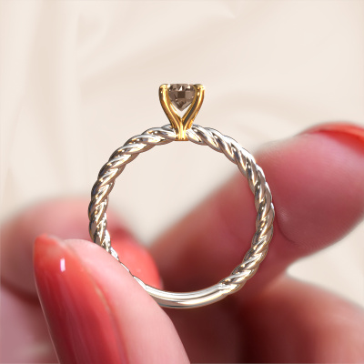 The ring shown above is called the Twanna, we call this a solitaire ring because it contains a single gemstone. The engagement ring is made in 14 Carat white gold and has a round brown diamond of 0.50 crt. This fantasy white gold solitaire ring with exquisite round brown diamond is a beautiful engagement ring. The open prong setting allows light to strike the gemstone from various angles. The ring also stands out because of the high positioning of the gemstone. Because diamonds symbolize true love and purity, they make the perfect gift for the love of your life. The symbol of eternal love is the centerpiece of this solitaire ring. Like a diamond, all other types of precious metal have their own attributed symbolic meaning. You can compile the solitaire engagement ring yourself in various precious metal combinations. This one has the combination of 14 Carat white gold with gold. Each piece of jewelry is made by a team of passionate goldsmiths and jewel designers. This will make your crown jewel truly eye-catching.After receiving your order, our goldsmiths will passionately start the creative process of making your engagement ring in our own studio. Because we don't have a big stockpile, these costs will not be passed on to you. Our pricing is proof of that! We offer top quality jewels at lowest price, guaranteed.Do you have a specific ring in mind? One you came across somewhere. Please feel free to tell us your wishes and we will turn your design into a unique engagement ring. You can follow the development of your ring design because we use 3D drawings. This gives you a realistic preview of your design. We will gladly send you a non-binding offer, based on a fair price/ quality ratio. It will amaze you.To make it easier for you, we offer a 30 day return policy. Check our terms and conditions.