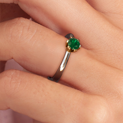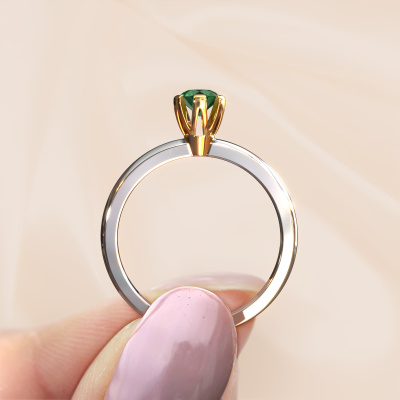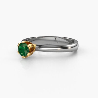 The ring shown above is called the Julia, we call this a solitaire ring because it contains a single gemstone. The engagement ring is made in 14 Carat white gold and has a round emerald of 4 mm. This trendy white gold solitaire ring with exquisite round emerald is a beautiful engagement ring. The open prong setting allows light to strike the gemstone from various angles. The ring also stands out because of the high positioning of the gemstone. Because diamonds symbolize true love and purity, they make the perfect gift for the love of your life. The symbol of eternal love is the centerpiece of this solitaire ring. Like a diamond, all other types of precious metal have their own attributed symbolic meaning. You can compile the solitaire engagement ring yourself in various precious metal combinations. This one has the combination of 14 Carat white gold with gold. Each piece of jewelry is created to add sparkle to your finger, each jewel is lovingly made by hand by our goldsmiths.Are you on a budget? Please feel free to contact us, so we can go discuss your options. We offer our engagement rings at guaranteed best price, because we make them to order. You won't find such a price anywhere else!Different styles of new rings are made daily by our team. Perhaps you have found a solitaire engagement ring somewhere. One you would like to give to your loved one. Please feel free to share your thoughts and design with our jewel designers. We would love to turn your design into a trendy engagement ring. You can follow the development of your ring design because we use very detailed 3D drawings. On top of that, you can order a dummy of the design. A dummy is a plastic ring, which can be shaped according your ring design. You can try it on and check if the engagement ring is up to standard. We will gladly send you a non-binding offer, based on a fair price/ quality ratio. The offer will baffle you, considering the quality of the ring and gemstones.To make it easier for you, we offer a 30 day return policy. Check our terms and conditions.
