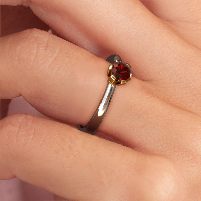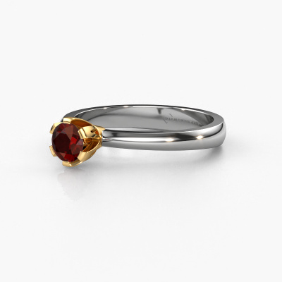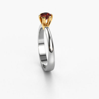 The ring shown above is called the Julia, we call this a solitaire ring because it contains a single gemstone. The engagement ring is made in 14 Carat white gold and has a round garnet of 4 mm. This trendy white gold solitaire ring with exquisite round garnet is a beautiful engagement ring. The open prong setting allows light to strike the gemstone from various angles. The ring also stands out because of the high positioning of the gemstone. Because diamonds symbolize true love and purity, they make the perfect gift for the love of your life. The symbol of eternal love is the centerpiece of this solitaire ring. Like a diamond, all other types of precious metal have their own attributed symbolic meaning. You can compile the solitaire engagement ring yourself in various precious metal combinations. This one has the combination of 14 Carat white gold with gold. Each piece of jewelry is created to add sparkle to your finger, each jewel is lovingly made by hand by our goldsmiths.Are you on a budget? Please feel free to contact us, so we can go discuss your options. We offer our engagement rings at guaranteed best price, because we make them to order. You won't find such a price anywhere else!Different styles of new rings are made daily by our team. Perhaps you have found a solitaire engagement ring somewhere. One you would like to give to your loved one. Please feel free to share your thoughts and design with our jewel designers. We would love to turn your design into a trendy engagement ring. You can follow the development of your ring design because we use very detailed 3D drawings. On top of that, you can order a dummy of the design. A dummy is a plastic ring, which can be shaped according your ring design. You can try it on and check if the engagement ring is up to standard. We will gladly send you a non-binding offer, based on a fair price/ quality ratio. The offer will baffle you, considering the quality of the ring and gemstones.To make it easier for you, we offer a 30 day return policy. Check our terms and conditions.