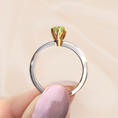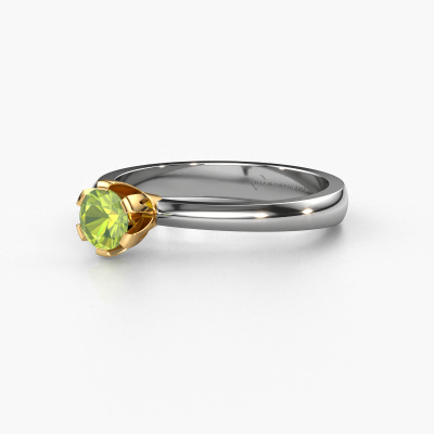 The ring shown above is called the Julia, we call this a solitaire ring because it contains a single gemstone. The engagement ring is made in 14 Carat white gold and has a round peridot of 4 mm. This trendy white gold solitaire ring with exquisite round peridot is a beautiful engagement ring. The open prong setting allows light to strike the gemstone from various angles. The ring also stands out because of the high positioning of the gemstone. Because diamonds symbolize true love and purity, they make the perfect gift for the love of your life. The symbol of eternal love is the centerpiece of this solitaire ring. Like a diamond, all other types of precious metal have their own attributed symbolic meaning. You can compile the solitaire engagement ring yourself in various precious metal combinations. This one has the combination of 14 Carat white gold with gold. Each piece of jewelry is created to add sparkle to your finger, each jewel is lovingly made by hand by our goldsmiths.Are you on a budget? Please feel free to contact us, so we can go discuss your options. We offer our engagement rings at guaranteed best price, because we make them to order. You won't find such a price anywhere else!Different styles of new rings are made daily by our team. Perhaps you have found a solitaire engagement ring somewhere. One you would like to give to your loved one. Please feel free to share your thoughts and design with our jewel designers. We would love to turn your design into a trendy engagement ring. You can follow the development of your ring design because we use very detailed 3D drawings. On top of that, you can order a dummy of the design. A dummy is a plastic ring, which can be shaped according your ring design. You can try it on and check if the engagement ring is up to standard. We will gladly send you a non-binding offer, based on a fair price/ quality ratio. The offer will baffle you, considering the quality of the ring and gemstones.To make it easier for you, we offer a 30 day return policy. Check our terms and conditions.