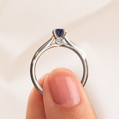 The ring shown above is called the Valorie ovl 1, we call this a solitaire ring because it contains a single gemstone. The engagement ring is made in 14 Carat white gold and has a oval sapphire of 6.5x4.5 mm. This modern white gold solitaire ring with exquisite oval sapphire is a beautiful engagement ring. The open prong setting allows light to strike the gemstone from various angles. The ring also stands out because of the high positioning of the gemstone. Because diamonds symbolize true love and purity, they make the perfect gift for the love of your life. The symbol of eternal love is the centerpiece of this solitaire ring. Like a diamond, all other types of precious metal have their own attributed symbolic meaning. You can compile the solitaire engagement ring yourself in various precious metal combinations. This one has the combination of 14 Carat white gold with white gold. Each piece of jewelry is made just for you, with attention to detail and design.By using our modern techniques, we can design and customize the finest quality jewels with the utmost care for you. Our engagement rings are always priced 30 percent lower than other jewellers. We make engagement rings to order so we don't have to maintain a large stock. If you have a certain budget, we are more than happy to advice you accordingly.Do you have a specific ring in mind? One you came across somewhere. Please feel free to tell us your wishes and we will turn your design into a unique engagement ring. You can follow the development of your ring design because we use 3D drawings. This gives you a realistic preview of your design. We will gladly send you a non-binding offer, based on a fair price/ quality ratio. It will amaze you.To make it easier for you, we offer a 30 day return policy. Check our terms and conditions.