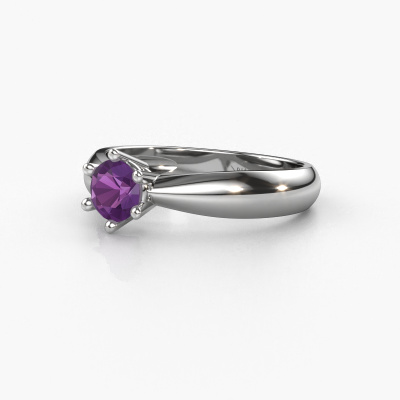 The ring shown above is called the Fay, we call this a solitaire ring because it contains a single gemstone. The engagement ring is made in 14 Carat white gold and has a round amethyst of 5 mm. This traditional white gold solitaire ring with exquisite round amethyst is a beautiful engagement ring. The open prong setting allows light to strike the gemstone from various angles. The ring also stands out because of the high positioning of the gemstone. Because diamonds symbolize true love and purity, they make the perfect gift for the love of your life. The symbol of eternal love is the centerpiece of this solitaire ring. Like a diamond, all other types of precious metal have their own attributed symbolic meaning. You can compile the solitaire engagement ring yourself in various precious metal combinations. This one has the combination of 14 Carat white gold with white gold. Each piece of jewelry is made just for you by our master goldsmiths in our own studio.By using a combination of the latest modern techniques, combined with ancient crafting, we can make all our engagement rings in our own studio. Each jewel is made to order. This is advantageous because we can offer you a price you won't find anywhere else.Have you found a specific engagement ring somewhere which you would like to give to your loved one? Please feel free to express your wishes to our jewel designers because we would be honoured to turn your design into a traditional engagement ring. You can follow the development of your ring design because we use 3D drawings. This gives you a realistic preview of how your design will look. You can also preorder a dummy. A dummy is a plastic ring, which can be shaped according your ring design. You can try it on and check if its width and size are suitable for you. We will gladly send you a non-binding offer, based on a fair price/ quality ratio. It will amaze you, considering the quality of the ring and gemstones.To make it easier for you, we offer a 30 day return policy. Check our terms and conditions.