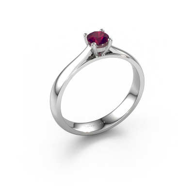 The ring shown above is called the Sam, we call this a solitaire ring because it contains a single gemstone. The engagement ring is made in 14 Carat white gold and has a round rhodolite of 4.2 mm. This classic white gold solitaire ring with exquisite round rhodolite is a beautiful engagement ring. The open prong setting allows light to strike the gemstone from various angles. The ring also stands out because of the high positioning of the gemstone. Because diamonds symbolize true love and purity, they make the perfect gift for the love of your life. The symbol of eternal love is the centerpiece of this solitaire ring. Like a diamond, all other types of precious metal have their own attributed symbolic meaning. You can compile the solitaire engagement ring yourself in various precious metal combinations. This one has the combination of 14 Carat white gold with white gold. Each piece of jewelry is made just for you, with attention to detail and design.After receiving your order, our goldsmiths will passionately start the creative process of making your engagement ring in our own studio. Because we don't have a big stockpile, these costs will not be passed on to you. Our pricing is proof of that! We offer top quality jewels at lowest price, guaranteed.Our team adds new designs to our online collection daily. Our designers and goldsmiths work together in creating the best design. We strive to offer a diverse collection of jewels. Perhaps you have a specific jewel design in mind. One you came across somewhere. Please contact us for a free consultation. We will make you an offer, based on a fair price/ quality ratio, that will baffle you.To make it easier for you, we offer a 30 day return policy. Check our terms and conditions.