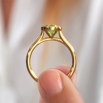This 14 Carat gold ring is called Lavon OVL and is set with 9x7 mm peridot. This exclusive gold solitaire engagement ring is a true work of art! The ornaments are crafted with a lot of patience and great passion. In order to create this ring with great precision, this craft requires a keen eye and skilful hand. A challenge which ignites a fire in our expert goldsmith. The exquisite peridot are set in a special way so they stand out even more. This gives the ring an even more glamorous appearance. The edgy engagement ring is actually unique on its own because of the gemstones which we carefully select especially for this ring. On top of that you select the precious metals which will be used to create a unique ring for the most extraordinary woman in your life! This jewel is created to add sparkle to your finger, each jewel is lovingly made by hand by our goldsmiths.By using our modern techniques, we can design and customize the finest quality jewels with the utmost care for you. Our engagement rings are always priced 30 percent lower than other jewellers. We make engagement rings to order so we don't have to maintain a large stock. If you have a certain budget, we are more than happy to advice you accordingly.Our team adds new designs to our online collection daily. Our designers and goldsmiths work together in creating the best design. We strive to offer a diverse collection of jewels. Perhaps you have a specific jewel design in mind. One you came across somewhere. Please contact us for a free consultation. We will make you an offer, based on a fair price/ quality ratio, that will baffle you.To make it easier for you, we offer a 30 day return policy. Check our terms and conditions.