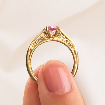 This 14 Carat gold ring is called Shannon rad and is set with 6.5x4.5 mm pink lab grown diamond. An extraordinary gold vintage ring. One that will surely make the love of your life shine like a diamond! That is what we hope to achieve. This Celtic engagement ring is set with exquisite pink lab grown diamond. Whichever gemstone you choose from our selection, is up to you. The gemstone is selected with great care because we believe your ajour engagement ring must be adorned with nothing but the most beautiful gemstone. Wouldn't you agree? Our expert goldsmith will design your ring in our own crafting studio, where the pink lab grown diamond will be set with great precision. The ring will then be polished till it shines perfectly. Nothing but the best for the love of your life! This jewel is made to shine bright around your finger. Each jewel is hand made with love by our goldsmiths.Are you on a budget? Please feel free to contact us, so we can go discuss your options. We offer our engagement rings at guaranteed best price, because we make them to order. You won't find such a price anywhere else!Our team adds new designs to our online collection daily. Our designers and goldsmiths work together in creating the best design. We strive to offer a diverse collection of jewels. Perhaps you have a specific jewel design in mind. One you came across somewhere. Please contact us for a free consultation. We will make you an offer, based on a fair price/ quality ratio, that will baffle you.To make it easier for you, we offer a 30 day return policy. Check our terms and conditions.