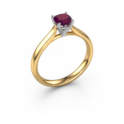 This 14 Carat gold ring is called Mignon cus 1 and is set with 5 mm rhodolite. This exclusive gold solitaire engagement ring is a true work of art! The ornaments are crafted with a lot of patience and great passion. In order to create this ring with great precision, this craft requires a keen eye and skilful hand. A challenge which ignites a fire in our expert goldsmith. The exquisite rhodolite are set in a special way so they stand out even more. This gives the ring an even more glamorous appearance. The edgy engagement ring is actually unique on its own because of the gemstones which we carefully select especially for this ring. On top of that you select the precious metals which will be used to create a unique ring for the most extraordinary woman in your life! This jewel is made by a team of passionate goldsmiths and jewel designers. This will make your crown jewel truly eye-catching.Are you on a budget? Please feel free to contact us, so we can go discuss your options. We offer our engagement rings at guaranteed best price, because we make them to order. You won't find such a price anywhere else!Different styles of new rings are made daily by our team. Perhaps you have found a solitaire engagement ring somewhere. One you would like to give to your loved one. Please feel free to share your thoughts and design with our jewel designers. We would love to turn your design into a luxury engagement ring. You can follow the development of your ring design because we use very detailed 3D drawings. On top of that, you can order a dummy of the design. A dummy is a plastic ring, which can be shaped according your ring design. You can try it on and check if the engagement ring is up to standard. We will gladly send you a non-binding offer, based on a fair price/ quality ratio. The offer will baffle you, considering the quality of the ring and gemstones.To make it easier for you, we offer a 30 day return policy. Check our terms and conditions.