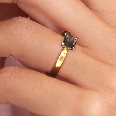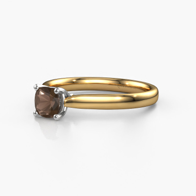 This 14 Carat gold ring is called Mignon cus 1 and is set with 5 mm smokey quartz. This exclusive gold solitaire engagement ring is a true work of art! The ornaments are crafted with a lot of patience and great passion. In order to create this ring with great precision, this craft requires a keen eye and skilful hand. A challenge which ignites a fire in our expert goldsmith. The exquisite smokey quartz are set in a special way so they stand out even more. This gives the ring an even more glamorous appearance. The edgy engagement ring is actually unique on its own because of the gemstones which we carefully select especially for this ring. On top of that you select the precious metals which will be used to create a unique ring for the most extraordinary woman in your life! This jewel is made by a team of passionate goldsmiths and jewel designers. This will make your crown jewel truly eye-catching.Are you on a budget? Please feel free to contact us, so we can go discuss your options. We offer our engagement rings at guaranteed best price, because we make them to order. You won't find such a price anywhere else!Different styles of new rings are made daily by our team. Perhaps you have found a solitaire engagement ring somewhere. One you would like to give to your loved one. Please feel free to share your thoughts and design with our jewel designers. We would love to turn your design into a luxury engagement ring. You can follow the development of your ring design because we use very detailed 3D drawings. On top of that, you can order a dummy of the design. A dummy is a plastic ring, which can be shaped according your ring design. You can try it on and check if the engagement ring is up to standard. We will gladly send you a non-binding offer, based on a fair price/ quality ratio. The offer will baffle you, considering the quality of the ring and gemstones.To make it easier for you, we offer a 30 day return policy. Check our terms and conditions.