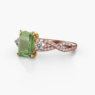 This 14 Carat rose gold ring is called Marilou EME and is set with tourmaline green. How would you describe the style of the love of your life? Does she have a unique sense of style? This stunning split band rose gold engagement ring can be custom-made to your own or her liking. Our tourmaline green gemstones have been carefully selected because we believe your luxury engagement ring must be adorned with nothing but the most beautiful gemstone. Don't you agree? This jewel is made to shine bright around your finger. Each jewel is hand made with love by our goldsmiths.After receiving your order, our goldsmiths will start the creative process of making your Marilou EME engagement ring. We don't keep stock. This is advantageous because these costs will not be passed on to you. Therefore, we can offer jewellery at exceptionally low prices.Do you have a specific ring in mind? One you came across somewhere. Please feel free to tell us your wishes and we will turn your design into a unique engagement ring. You can follow the development of your ring design because we use 3D drawings. This gives you a realistic preview of your design. We will gladly send you a non-binding offer, based on a fair price/ quality ratio. It will amaze you.To make it easier for you, we offer a 30 day return policy. Check our terms and conditions.