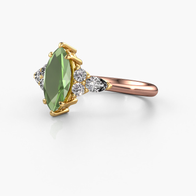 This 14 Carat rose gold ring is called Melani MRQ and is set with 11x5.5 mm tourmaline green. What is it that makes your relationship unique? What is it about her that makes you want to bend down on one knee? The unique bond between the two of you is emphasized by an equally unique ring. A one of a kind graceful cluster engagement ring made especially for her. That is why this trendy ring fits her like a glove. Each specific detail of this graceful rose gold tourmaline green set engagement ring is hand-picked, crafted and polished by our expert goldsmith. The result is an exquisite ring, unique and perfectly crafted to perfection. That is what our expert Goldsmiths strive for. This jewel is made just for you, with attention to detail and design.After receiving your order, our goldsmiths will passionately start the creative process of making your engagement ring in our own studio. Because we don't have a big stockpile, these costs will not be passed on to you. Our pricing is proof of that! We offer top quality jewels at lowest price, guaranteed.Do you have a specific ring in mind? One you came across somewhere. Please feel free to tell us your wishes and we will turn your design into a unique engagement ring. You can follow the development of your ring design because we use 3D drawings. This gives you a realistic preview of your design. We will gladly send you a non-binding offer, based on a fair price/ quality ratio. It will amaze you.To make it easier for you, we offer a 30 day return policy. Check our terms and conditions.