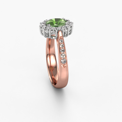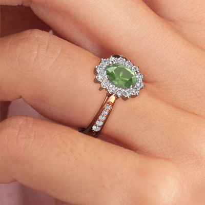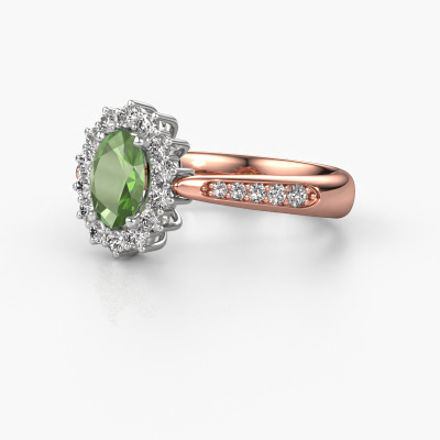 The ring shown above is called the Margien 2. We call this a Lady Diana ring. With an Lady Diana engagement ring, the larger centre gem is encircled by smaller side stones. This 14 Carat rose gold ring is set with a 7x5 mm oval tourmaline green gemstone, surrounded by smaller diamonds side stones. It's the most famous and celebrated engagement ring in the world; The Lady Diana ring. Exclusively meant for the most remarkable person in your life! A truly stunning aspect of this Lady Diana ring is its centre tourmaline green. The smaller side stones embracing the tourmaline green emphasize the sparkle of the centre gemstone, this makes it look as though they merge into one big gemstone. Due to its design, this is even more apparent in the Lady Di ring. Our expert Goldsmiths are keen to create a unique ring just for you. We can even customize the ring to your liking in our own crafting studio. This piece of jewellery is created to add sparkle to your finger, each jewel is lovingly made by hand by our goldsmiths.Are you on a budget? Please feel free to contact us, so we can go discuss your options. We offer our engagement rings at guaranteed best price, because we make them to order. You won't find such a price anywhere else!Our team adds new designs to our online collection daily. Our designers and goldsmiths work together in creating the best design. We strive to offer a diverse collection of jewels. Perhaps you have a specific jewel design in mind. One you came across somewhere. Please contact us for a free consultation. We will make you an offer, based on a fair price/ quality ratio, that will baffle you.To make it easier for you, we offer a 30 day return policy. Check our terms and conditions.