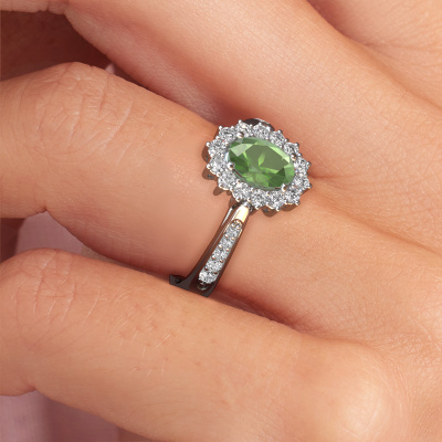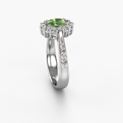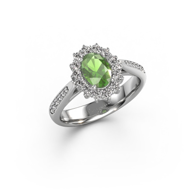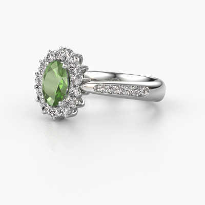 The ring shown above is called the Margien 2. We call this a Lady Diana ring. With an Lady Diana engagement ring, the larger centre gem is encircled by smaller side stones. This 14 Carat white gold ring is set with a 7x5 mm oval tourmaline green gemstone, surrounded by smaller diamonds side stones. It's the most famous and celebrated engagement ring in the world; The Lady Diana ring. Exclusively meant for the most remarkable person in your life! A truly stunning aspect of this Lady Diana ring is its centre tourmaline green. The smaller side stones embracing the tourmaline green emphasize the sparkle of the centre gemstone, this makes it look as though they merge into one big gemstone. Due to its design, this is even more apparent in the Lady Di ring. Our expert Goldsmiths are keen to create a unique ring just for you. We can even customize the ring to your liking in our own crafting studio. This piece of jewellery is created to add sparkle to your finger, each jewel is lovingly made by hand by our goldsmiths.Are you on a budget? Please feel free to contact us, so we can go discuss your options. We offer our engagement rings at guaranteed best price, because we make them to order. You won't find such a price anywhere else!Our team adds new designs to our online collection daily. Our designers and goldsmiths work together in creating the best design. We strive to offer a diverse collection of jewels. Perhaps you have a specific jewel design in mind. One you came across somewhere. Please contact us for a free consultation. We will make you an offer, based on a fair price/ quality ratio, that will baffle you.To make it easier for you, we offer a 30 day return policy. Check our terms and conditions.