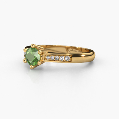 The ring shown above is called the Luna 2. We call this type of ring a pavé solitaire ring because it has one centre gemstone and a band that is also pave set with gemstones. This engagement ring is made in 14 Carat gold set with a 5 mm round tourmaline green, and pave set diamonds at the sides. Each piece of jewellery is unique in every way! Simply customize to your liking,This classic gold pavé solitaire engagement ring has an exquisite round tourmaline green centre stone. To further accentuate the centre stone, the band is set full with more diamonds. Its open prong setting allows light to strike the tourmaline green from various angles and this adds sparkle to your tourmaline green ring. The photo shown above depicts the goldsmith's carefully handcrafted details of the ring. The high positioning of the centre stone is truly eye-catching. The perfect engagement ring for the crown jewel of your life!Because we design and deliver our own rings, we can offer you a engagement ring at a price you won't find anywhere else. A ring is made to order, which helps prevent excess supplies, so we can make you a great price offer. We understand it feels risky, buying your engagement ring online, but we will gladly assist in the designing process, taking your budget into consideration.Our team adds new designs to our online collection daily. Our designers and goldsmiths work together in creating the best design. We strive to offer a diverse collection of jewels. Perhaps you have a specific jewel design in mind. One you came across somewhere. Please contact us for a free consultation. We will make you an offer, based on a fair price/ quality ratio, that will baffle you.To make it easier for you, we offer a 30 day return policy. Check our terms and conditions.