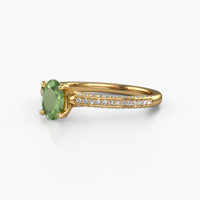 The ring shown above is called the Elenore ovl. We call this type of ring a pavé solitaire ring because it has one centre gemstone and a band that is also pave set with gemstones. This engagement ring is made in 14 Carat gold set with a 6.5x4.5 mm oval tourmaline green, and pave set diamonds at the sides. Each piece of jewellery is made by a team of passionate goldsmiths and jewel designers. This will make your crown jewel truly eye-catching.This exclusive gold pavé solitaire engagement ring has an exquisite oval tourmaline green centre stone. To further accentuate the centre stone, the band is set full with more diamonds. Its open prong setting allows light to strike the tourmaline green from various angles and this adds sparkle to your tourmaline green ring. The photo shown above depicts the goldsmith's carefully handcrafted details of the ring. The high positioning of the centre stone is truly eye-catching. The perfect engagement ring for the crown jewel of your life!After receiving your order, our goldsmiths will start the creative process of making your Elenore ovl engagement ring. We don't keep stock. This is advantageous because these costs will not be passed on to you. Therefore, we can offer jewellery at exceptionally low prices.Have you found a specific engagement ring somewhere which you would like to give to your loved one? Please feel free to express your wishes to our jewel designers because we would be honoured to turn your design into a exclusive engagement ring. You can follow the development of your ring design because we use 3D drawings. This gives you a realistic preview of how your design will look. You can also preorder a dummy. A dummy is a plastic ring, which can be shaped according your ring design. You can try it on and check if its width and size are suitable for you. We will gladly send you a non-binding offer, based on a fair price/ quality ratio. It will amaze you, considering the quality of the ring and gemstones.To make it easier for you, we offer a 30 day return policy. Check our terms and conditions.