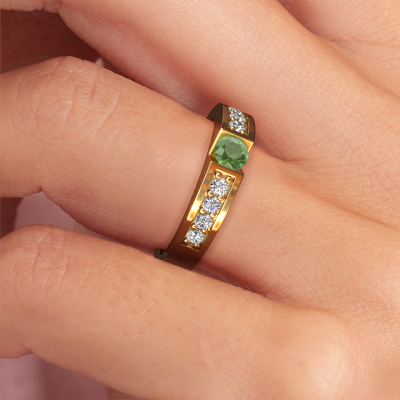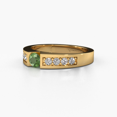 The ring shown above is called the Lizzy 2. We call this type of ring a pavé solitaire ring because it has one centre gemstone and a band that is also pave set with gemstones. This engagement ring is made in 14 Carat gold set with a 4.2 mm round tourmaline green, and pave set diamonds at the sides. Each piece of jewellery is made to shine bright around your finger. Each jewel is hand made with love by our goldsmiths.This modern gold pavé solitaire engagement ring has an exquisite round tourmaline green centre stone. To further accentuate the centre stone, the band is set full with more diamonds. Its open prong setting allows light to strike the tourmaline green from various angles and this adds sparkle to your tourmaline green ring. The photo shown above depicts the goldsmith's carefully handcrafted details of the ring. The high positioning of the centre stone is truly eye-catching. The perfect engagement ring for the crown jewel of your life!By using a combination of the latest modern techniques, combined with ancient crafting, we can make all our engagement rings in our own studio. Each jewel is made to order. This is advantageous because we can offer you a price you won't find anywhere else.Our team adds new designs to our online collection daily. Our designers and goldsmiths work together in creating the best design. We strive to offer a diverse collection of jewels. Perhaps you have a specific jewel design in mind. One you came across somewhere. Please contact us for a free consultation. We will make you an offer, based on a fair price/ quality ratio, that will baffle you.To make it easier for you, we offer a 30 day return policy. Check our terms and conditions.