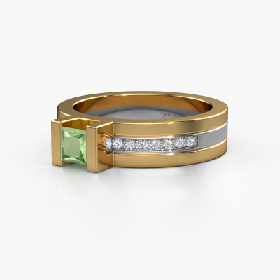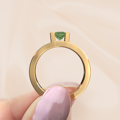 The ring shown above is called the Desire. We call this type of ring a pavé solitaire ring because it has one centre gemstone and a band that is also pave set with gemstones. The 14 Carat gold engagement ring is set with a princess 4 mm tourmaline green centre stone and the band is pave set with diamond gemstones. Each jewel is made just for you by our master goldsmiths in our own studio.This modern gold pavé solitaire engagement ring has an exquisite princess tourmaline green centre stone. To further accentuate the centre stone, the band is fully set with more diamonds. Its open prong setting allows light to strike the tourmaline green from various angles and this adds sparkle to your tourmaline green ring. The photo shown above depicts the goldsmith's carefully handcrafted details of the ring. The high positioning of the centre stone is truly eye-catching. The perfect engagement ring for the crown jewel of your life! By using a combination of the latest modern techniques, combined with ancient crafting, we can make all our engagement rings in our own studio. Each jewel is made to order. This is advantageous because we can offer you a price you won't find anywhere else.Have you found a specific engagement ring somewhere which you would like to give to your loved one? Please feel free to express your wishes to our jewel designers because we would be honoured to turn your design into a modern engagement ring. You can follow the development of your ring design because we use 3D drawings. This gives you a realistic preview of how your design will look. You can also preorder a dummy. A dummy is a plastic ring, which can be shaped according your ring design. You can try it on and check if its width and size are suitable for you. We will gladly send you a non-binding offer, based on a fair price/ quality ratio. It will amaze you, considering the quality of the ring and gemstones.To make it easier for you, we offer a 30 day return policy. Check our terms and conditions.