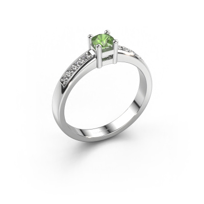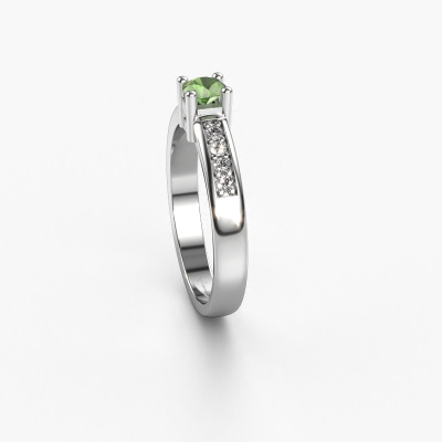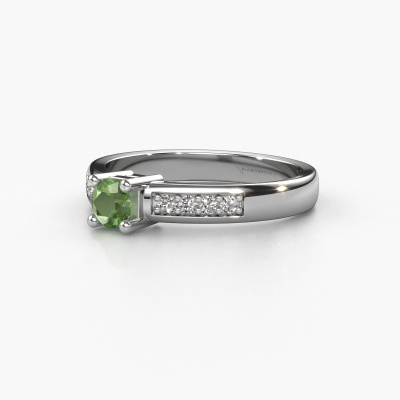 The ring shown above is called the Eline 2. We call this type of ring a pavé solitaire ring because it has one centre gemstone and a band that is also pave set with gemstones. The platinum engagement ring is set with a round 3.7 mm tourmaline green centre stone and the band is pave set with diamond gemstones. Each jewel is unique in every way! Simply customize to your liking,This modern platinum pavé solitaire engagement ring has an exquisite round tourmaline green centre stone. To further accentuate the centre stone, the band is fully set with more diamonds. Its open prong setting allows light to strike the tourmaline green from various angles and this adds sparkle to your tourmaline green ring. The photo shown above depicts the goldsmith's carefully handcrafted details of the ring. The high positioning of the centre stone is truly eye-catching. The perfect engagement ring for the crown jewel of your life! Because we design and deliver our own rings, we can offer you a engagement ring at a price you won't find anywhere else. A ring is made to order, which helps prevent excess supplies, so we can make you a great price offer. We understand it feels risky, buying your engagement ring online, but we will gladly assist in the designing process, taking your budget into consideration.Our team adds new designs to our online collection daily. Our designers and goldsmiths work together in creating the best design. We strive to offer a diverse collection of jewels. Perhaps you have a specific jewel design in mind. One you came across somewhere. Please contact us for a free consultation. We will make you an offer, based on a fair price/ quality ratio, that will baffle you.To make it easier for you, we offer a 30 day return policy. Check our terms and conditions.