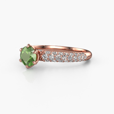 The ring shown above is called the Meryl. We call this type of ring a pavé solitaire ring because it has one centre gemstone and a band that is also pave set with gemstones. This engagement ring is made in 14 Carat rose gold set with a 5.7 mm round tourmaline green, and pave set diamonds at the sides. Each piece of jewellery is made just for you, with attention to detail and design.This exclusive rose gold pavé solitaire engagement ring has an exquisite round tourmaline green centre stone. To further accentuate the centre stone, the band is set full with more diamonds. Its open prong setting allows light to strike the tourmaline green from various angles and this adds sparkle to your tourmaline green ring. The photo shown above depicts the goldsmith's carefully handcrafted details of the ring. The high positioning of the centre stone is truly eye-catching. The perfect engagement ring for the crown jewel of your life!After receiving your order, our goldsmiths will passionately start the creative process of making your engagement ring in our own studio. Because we don't have a big stockpile, these costs will not be passed on to you. Our pricing is proof of that! We offer top quality jewels at lowest price, guaranteed.Have you found a specific engagement ring somewhere which you would like to give to your loved one? Please feel free to express your wishes to our jewel designers because we would be honoured to turn your design into a exclusive engagement ring. You can follow the development of your ring design because we use 3D drawings. This gives you a realistic preview of how your design will look. You can also preorder a dummy. A dummy is a plastic ring, which can be shaped according your ring design. You can try it on and check if its width and size are suitable for you. We will gladly send you a non-binding offer, based on a fair price/ quality ratio. It will amaze you, considering the quality of the ring and gemstones.To make it easier for you, we offer a 30 day return policy. Check our terms and conditions.